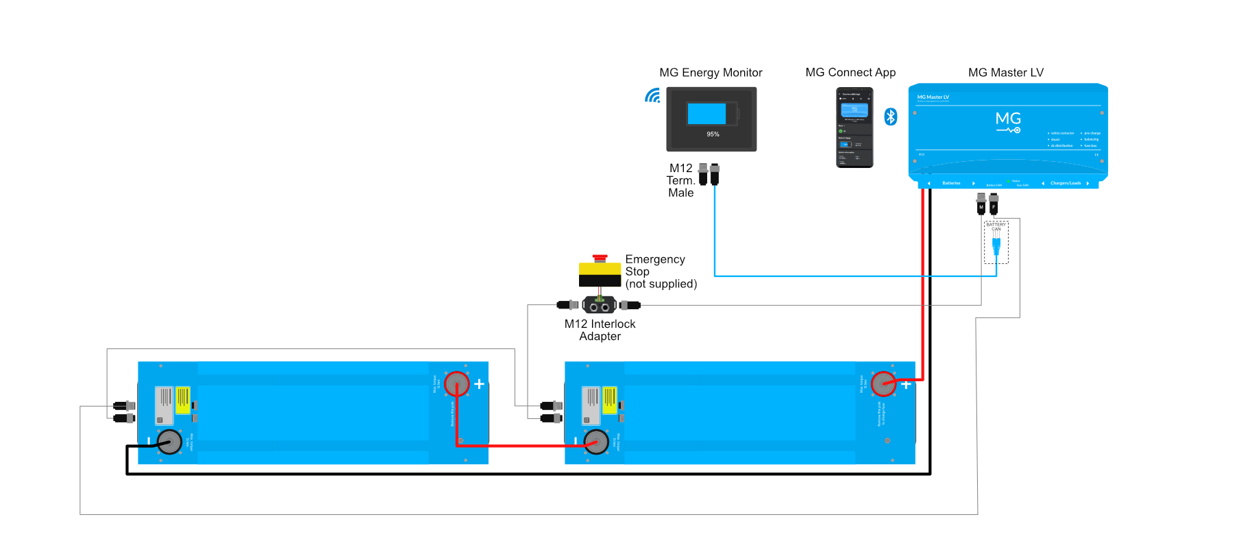 The M12 Interlock adapter is used to connect an emergency-stop button to a MG Master LV.When the emergency-stop button is pressed the MG Master LV will open its main safety contactor immediately and goes to the failsafe state.